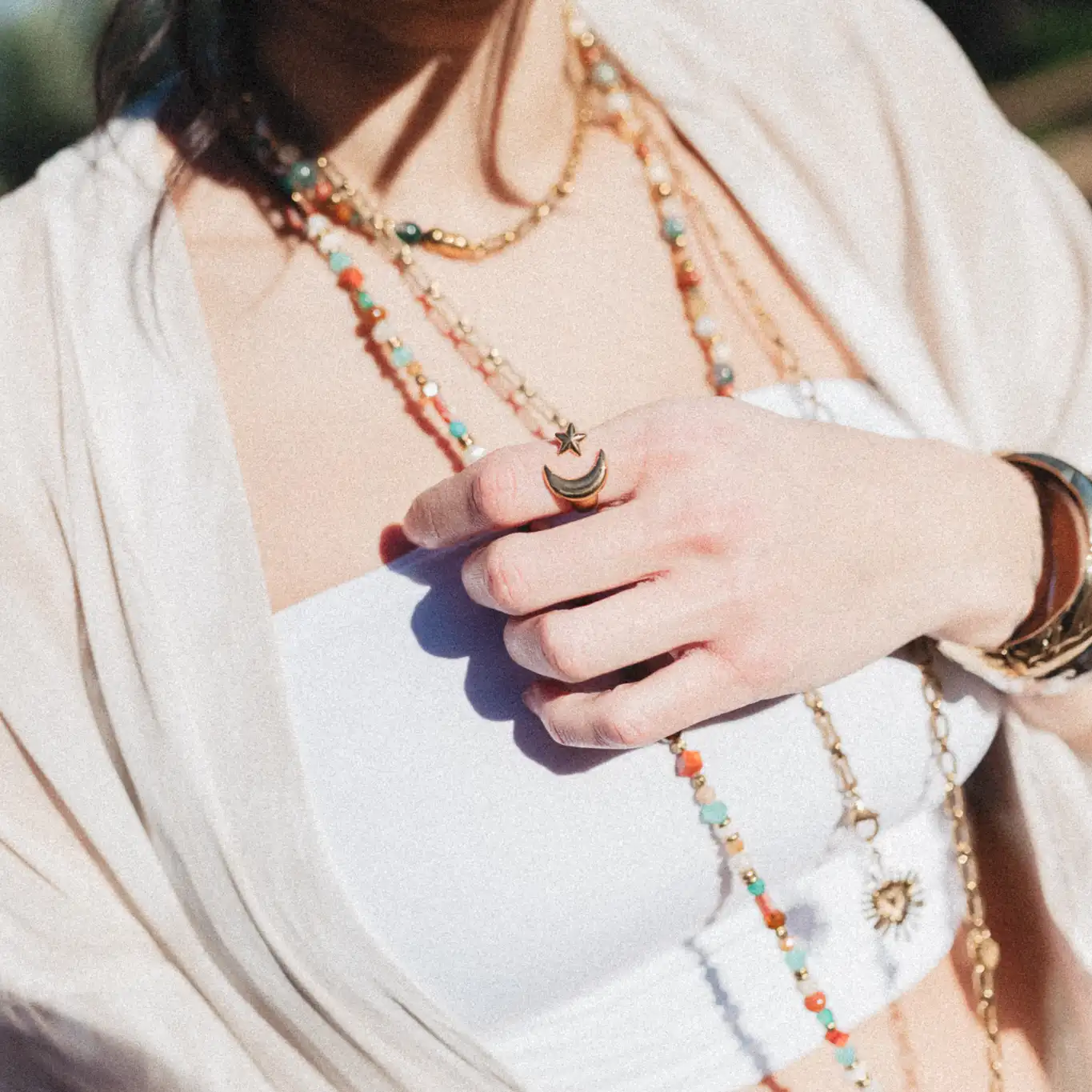 L’Anello Luna e Stella rappresenta l’incontro tra due simboli del cielo: la luna, legata all’intuizione e alla trasformazione, e la stella, guida luminosa che indica la direzione.