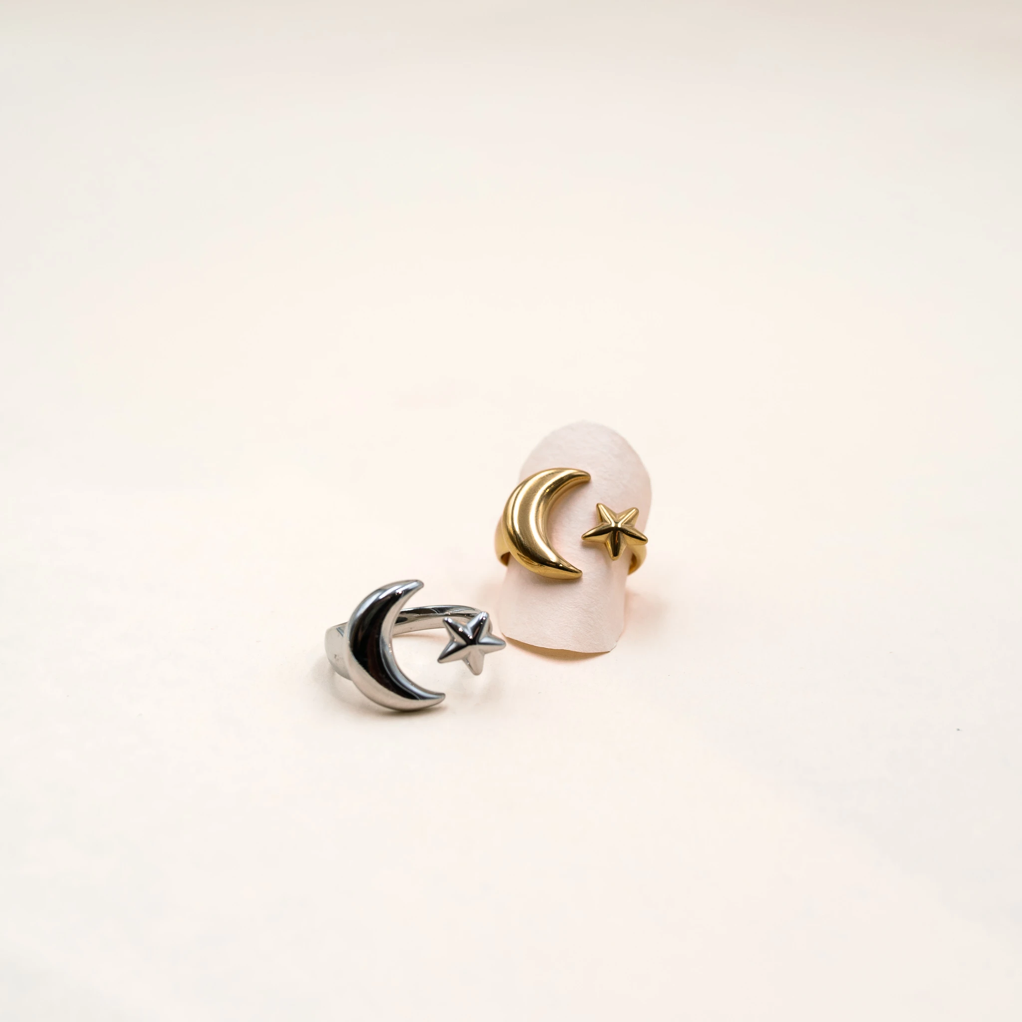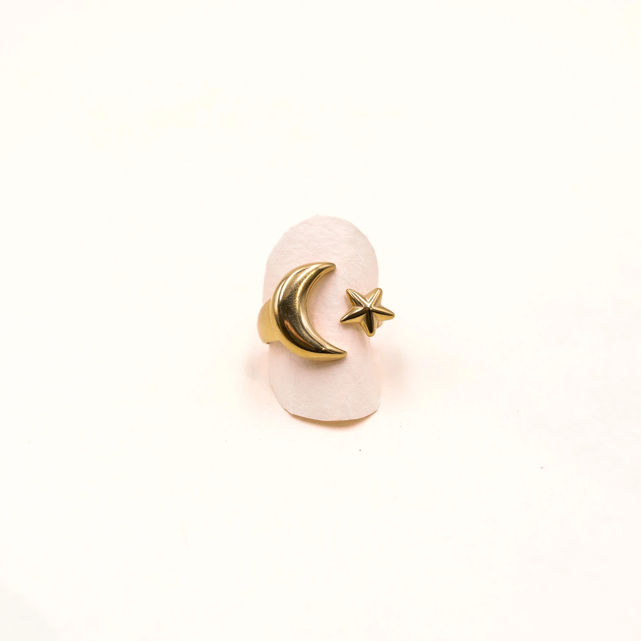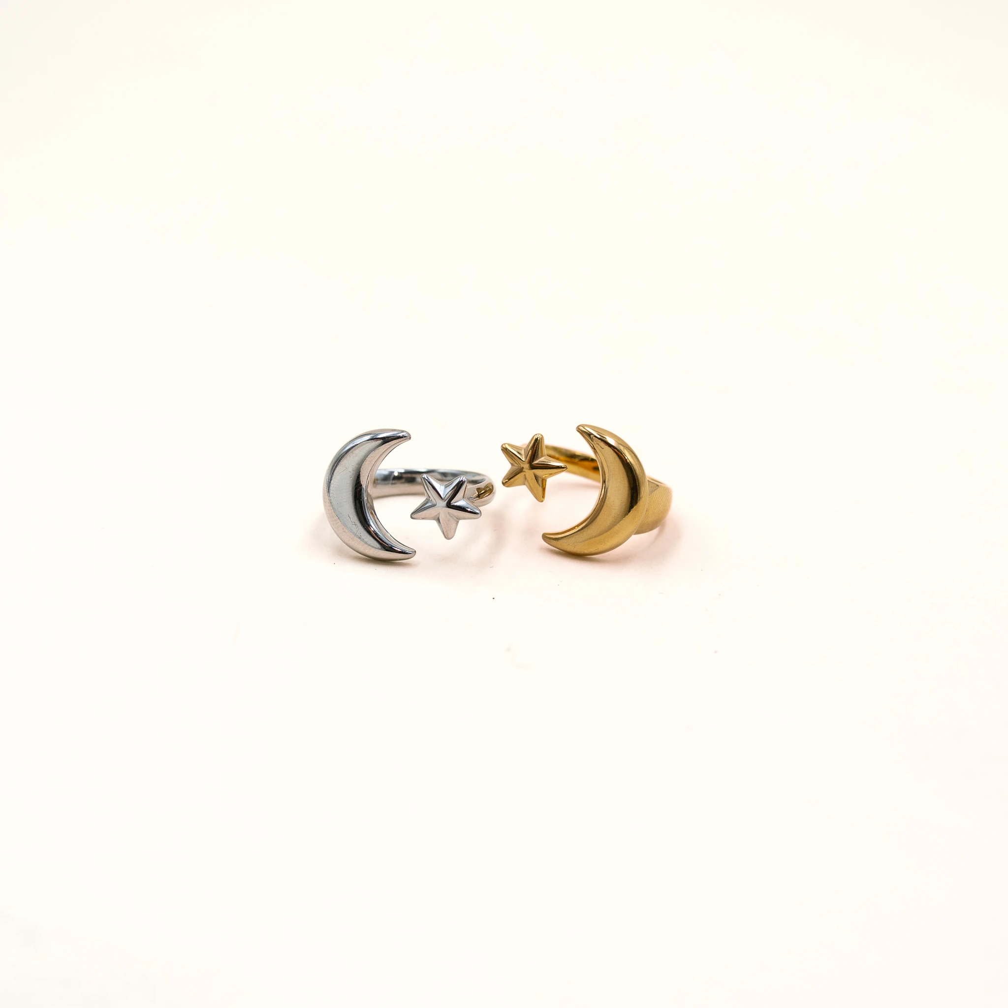 Anello regolabile in acciaio con luna e stella, simbolo di guida, intuizione e desideri.