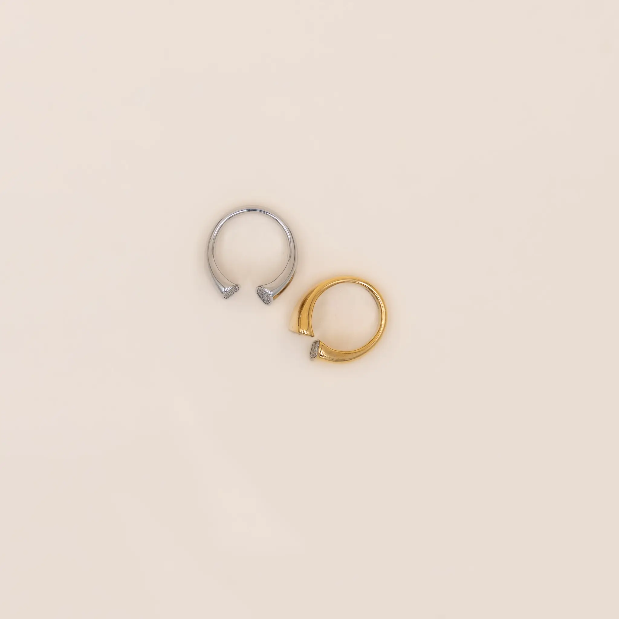 Realizzato in acciaio inox anallergico, è regolabile e disponibile in finitura dorata o argentata. Perfetto per chi cerca un anello luminoso, sofisticato e facilissimo da abbinare.