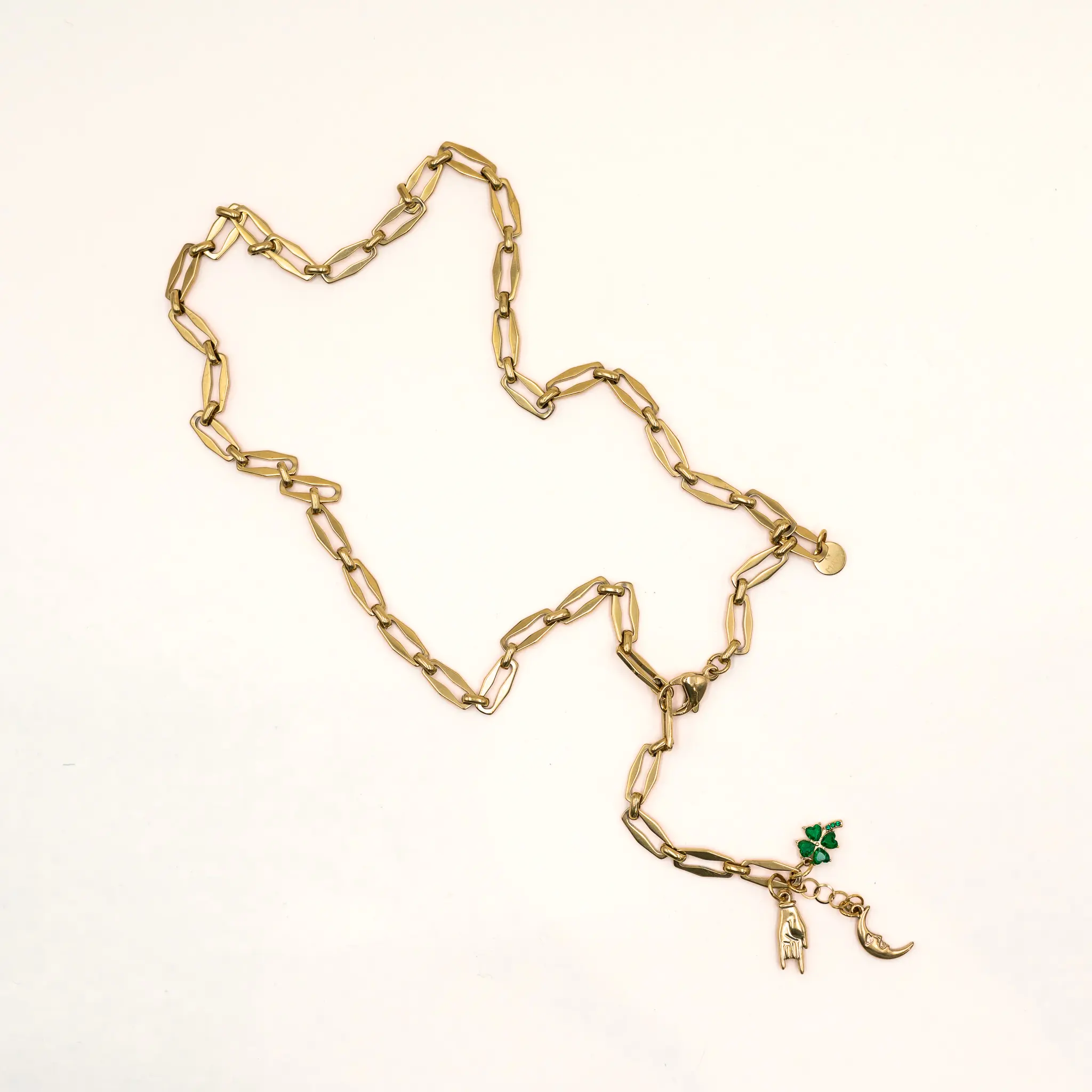 Può essere indossata in modi diversi, giocando con lunghezze. Con catena gold sfacettata, dinamica, luminosa.