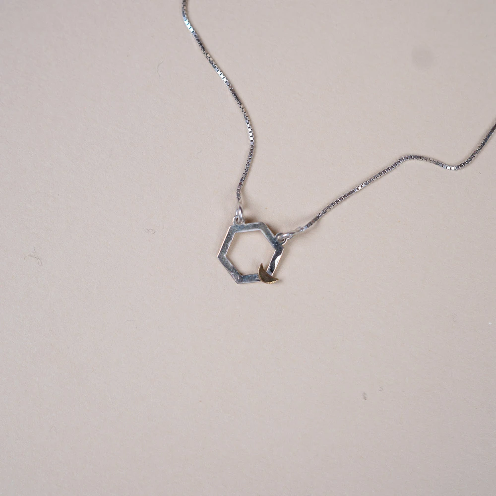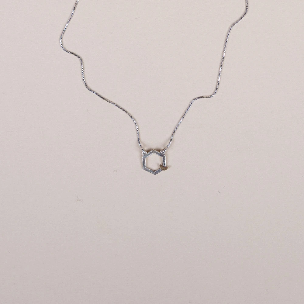 Ispirata alla molecola del benzene, questa collana racchiude un messaggio profondo: un equilibrio perfetto tra forze opposte, legami invisibili ma forti, che tengono insieme ciò che conta davvero.