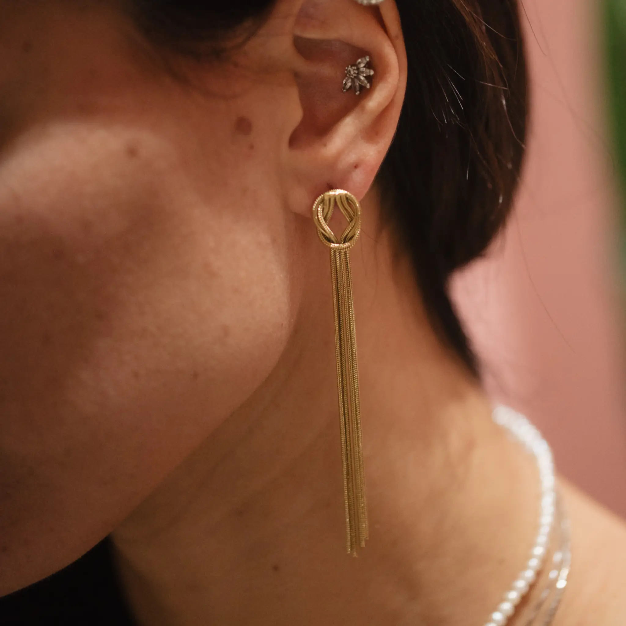 Il design pendente allunga visivamente il collo, mentre il nodo centrale dona un tocco di personalità senza appesantire. Un modello versatile, luminoso e comodissimo da indossare.
