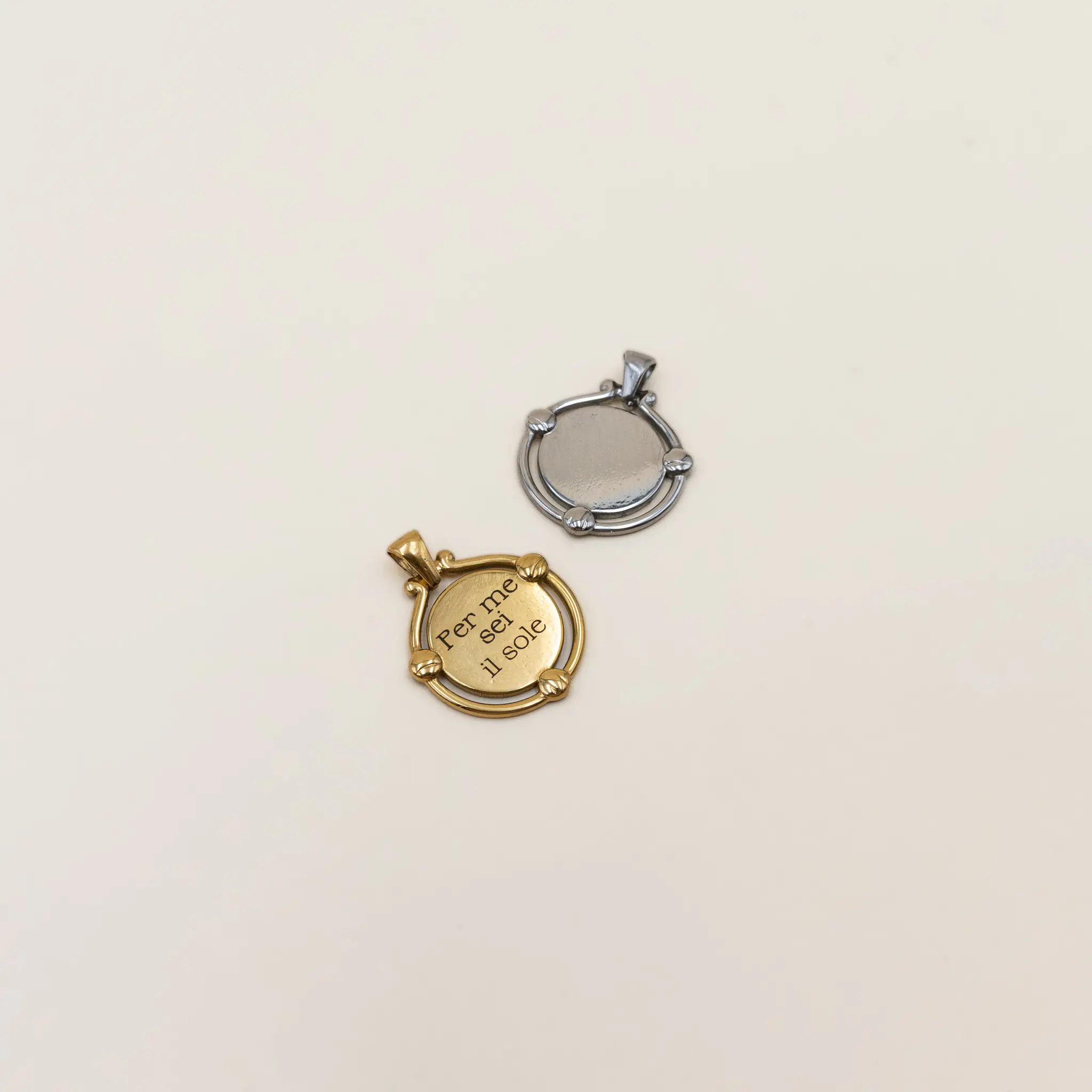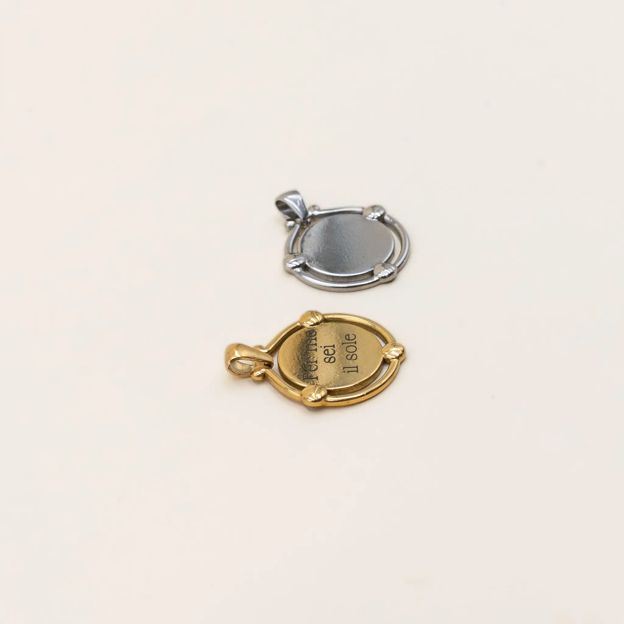Ciondolo tondo in acciaio anallergico da 18 mm, personalizzabile con un’incisione sul fronte e sul retro. Disponibile in finitura gold o silver, è il talismano ideale per custodire un ricordo, una parola o una frase speciale.