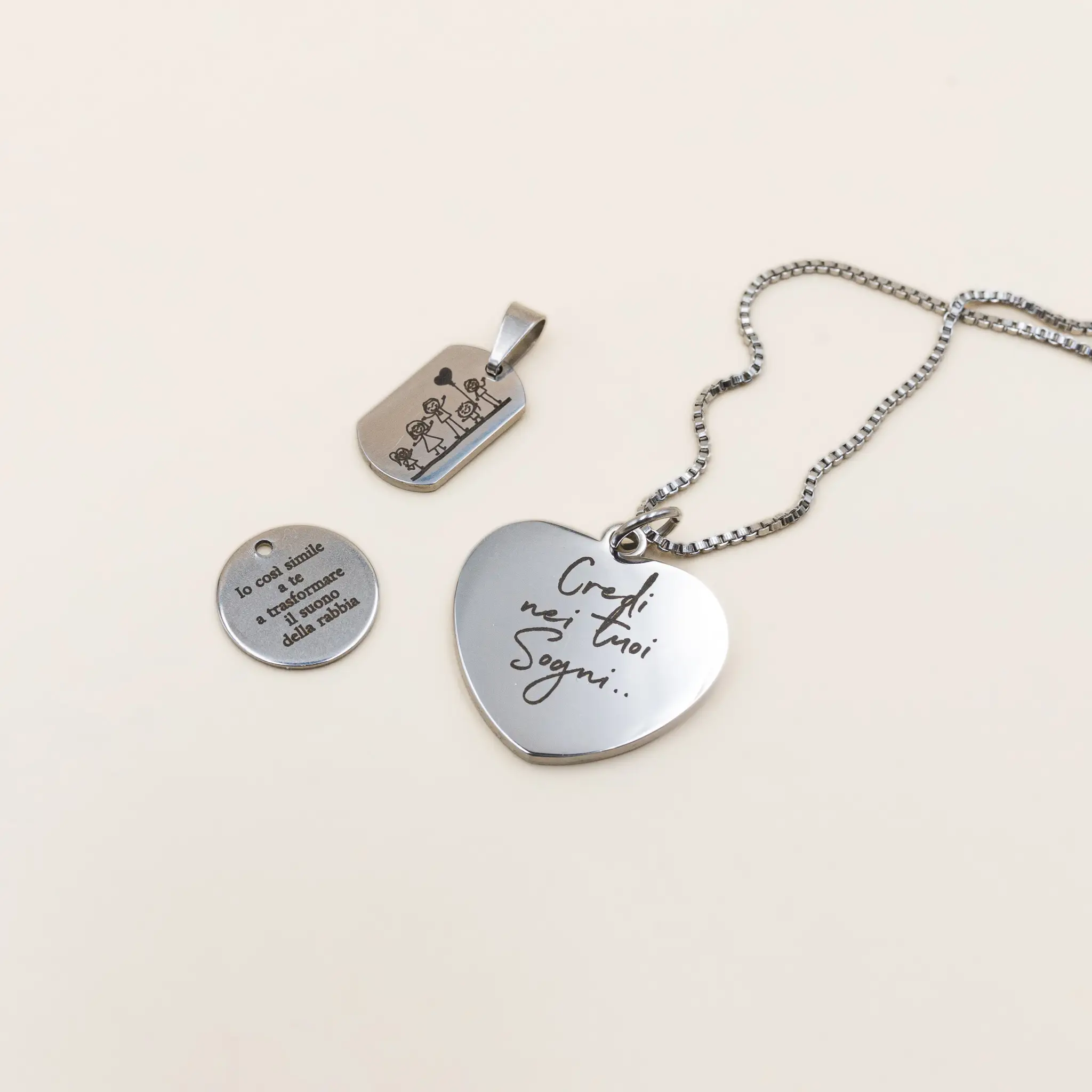 Disponibile in finitura gold o silver, offre un’incisione precisa e duratura su uno o entrambi i lati. Il design essenziale la rende perfetta da indossare ogni giorno o da regalare a chi ami, come talismano di significati personali.